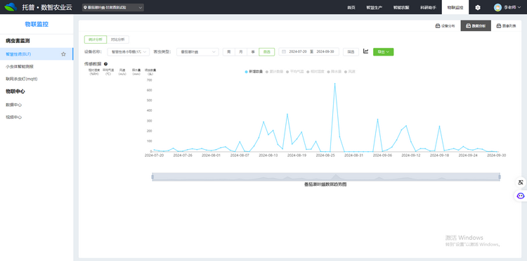3、AI識別計數(shù),實時監(jiān)測:AI識別番茄潛葉蛾,自動計數(shù),準確率高達95%以上,自動生成番茄潛葉蛾發(fā)生趨勢圖。