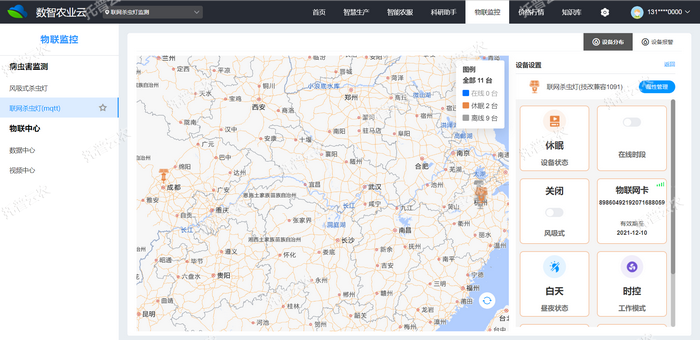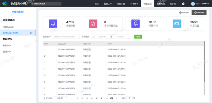 4、風吸式茶園殺蟲燈支持手機App與Web端控制,具有豐富的狀態(tài)信息展示,足不出戶就可以了解一切,如地理位置、設備編號、基地名稱、物聯(lián)網卡卡號、剩余流量、卡有效期、GSM天線連接是否正常等故障報警信息??蛇h程控制、查看設備的當前工作狀態(tài)、信號強度、電量使用等情況。